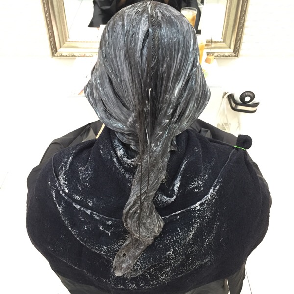 ベースに赤味が残ってますね!ここにかなり濃いめのアッシュグレーをナチュラルグラデーションで染めます!