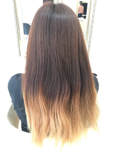 毛先はカラーバターでグラデーションになるようにピンクを濃厚に染めました。