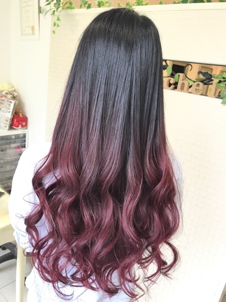 グラデーションで毛先に向かってレッドパープルの土台完成しました!
